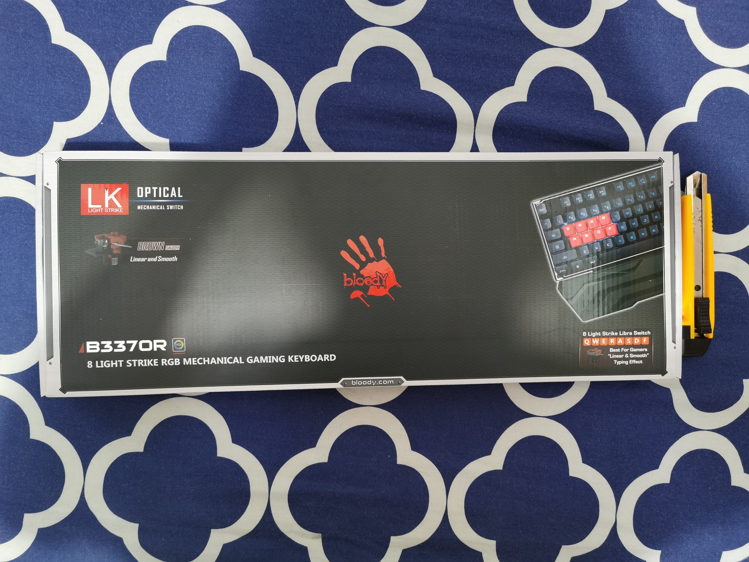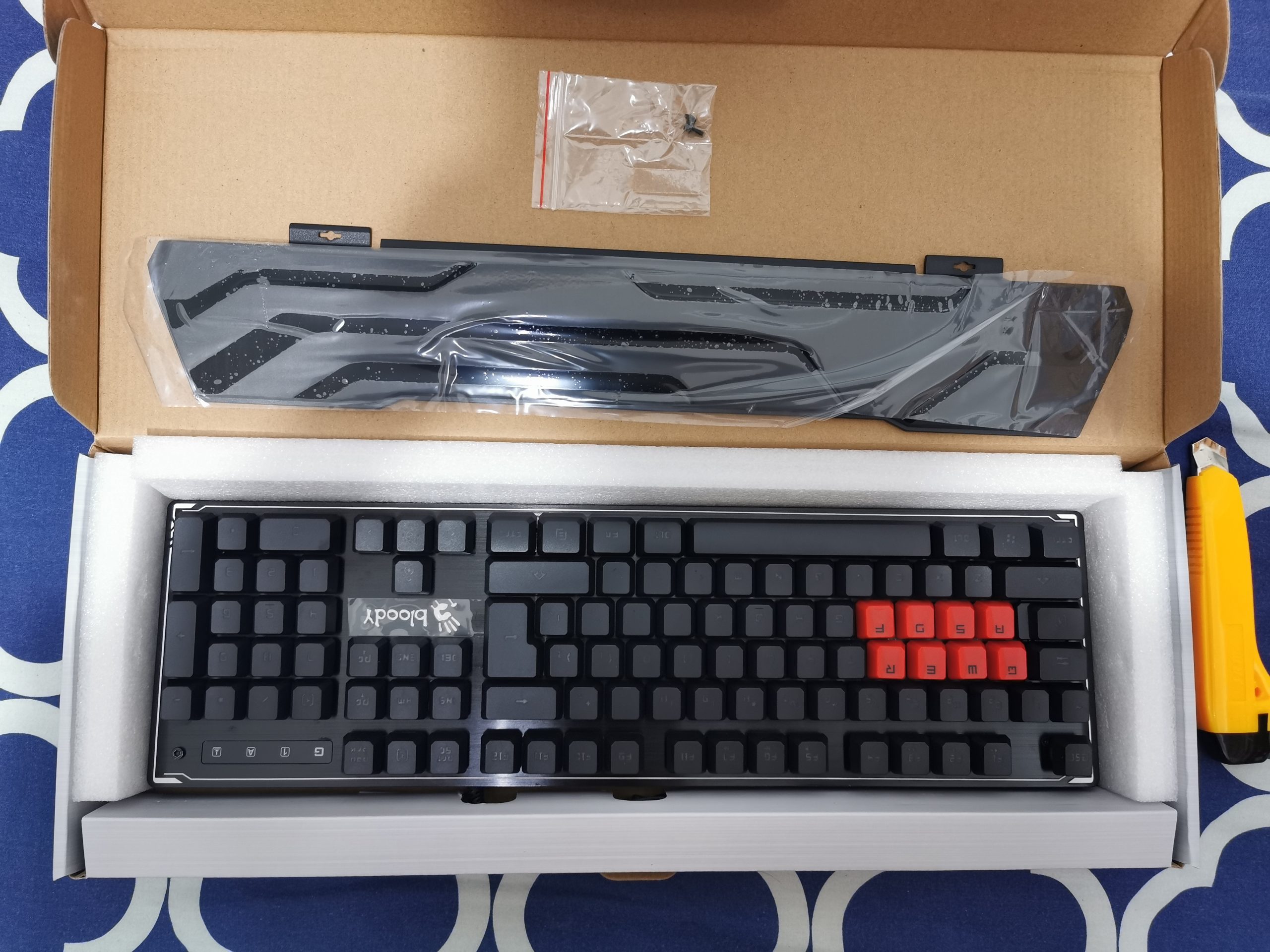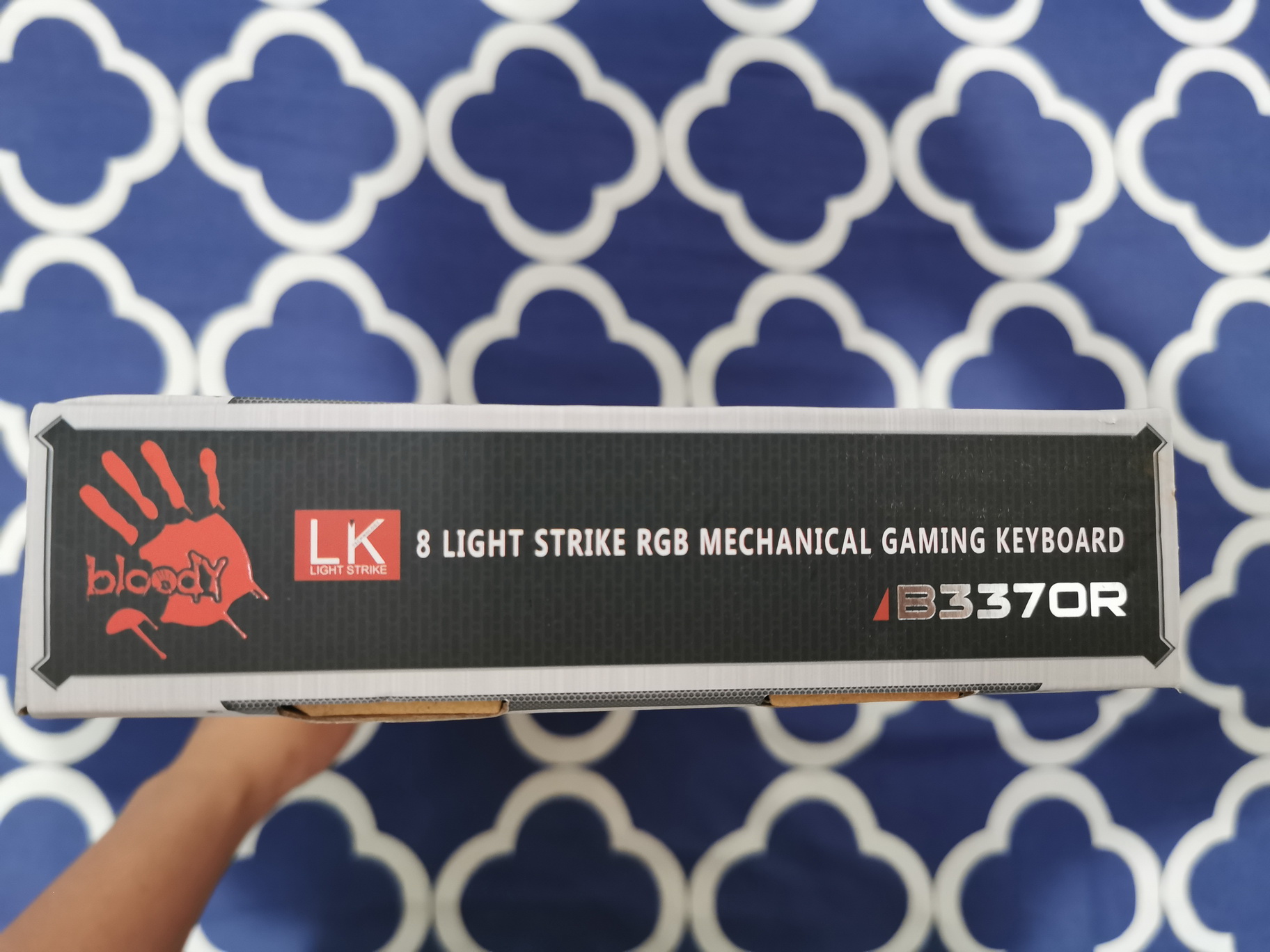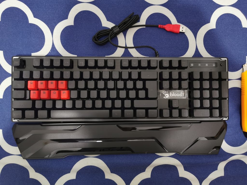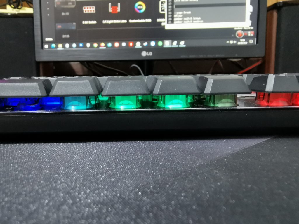Keyboardnya dalam posisi mati terlihat hitam legam sederhana, bagian papan dasar tiap key tampaknya terbuat dari aluminimum sementara caps dan wristpad nya terbuat dari plastik.