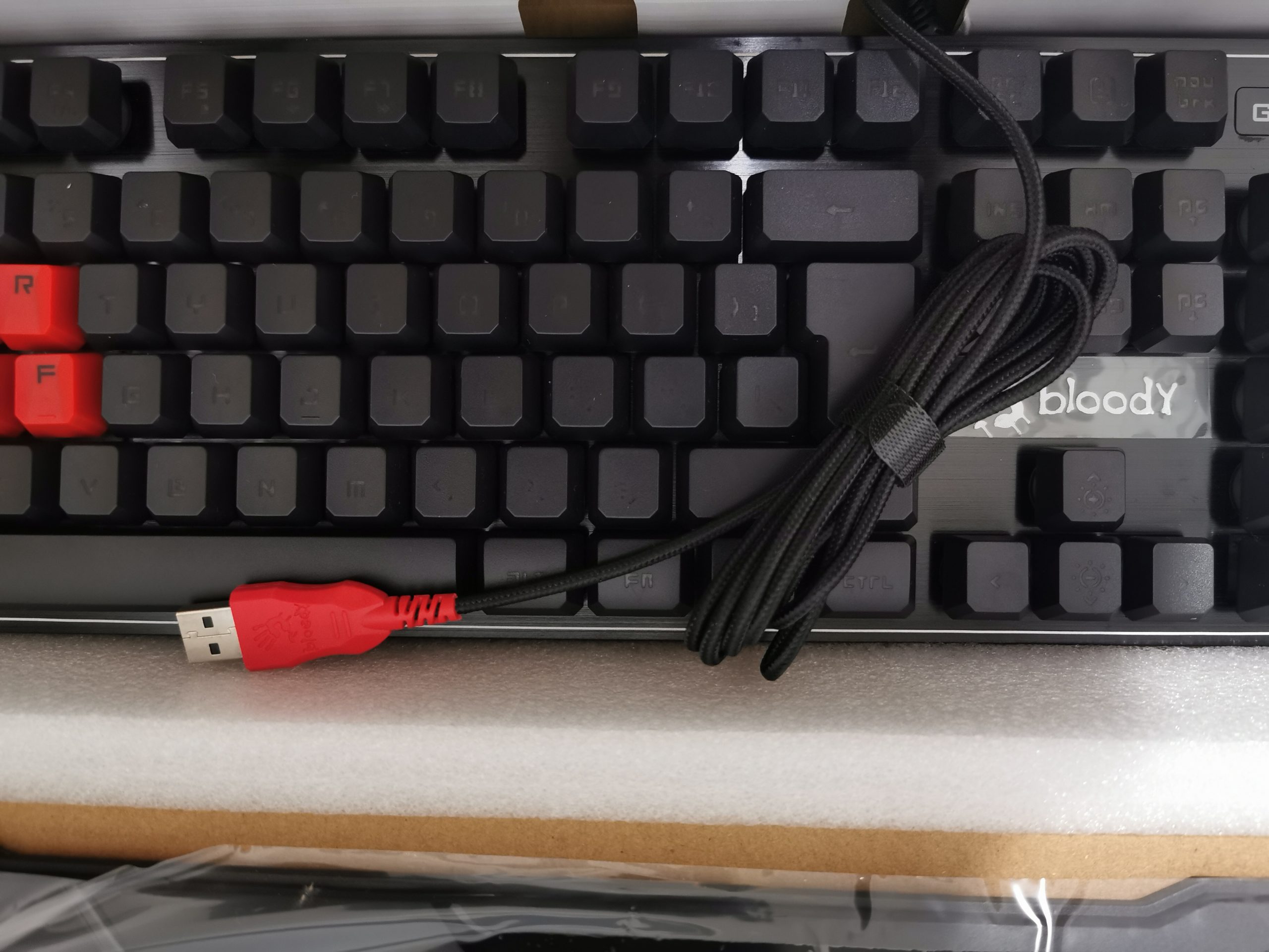 Bagian dalam kotak berisi keyboardnya di sarungkan dalam bubble wrap, beserta buku panduan, dan wrist rest atau wrist pad.