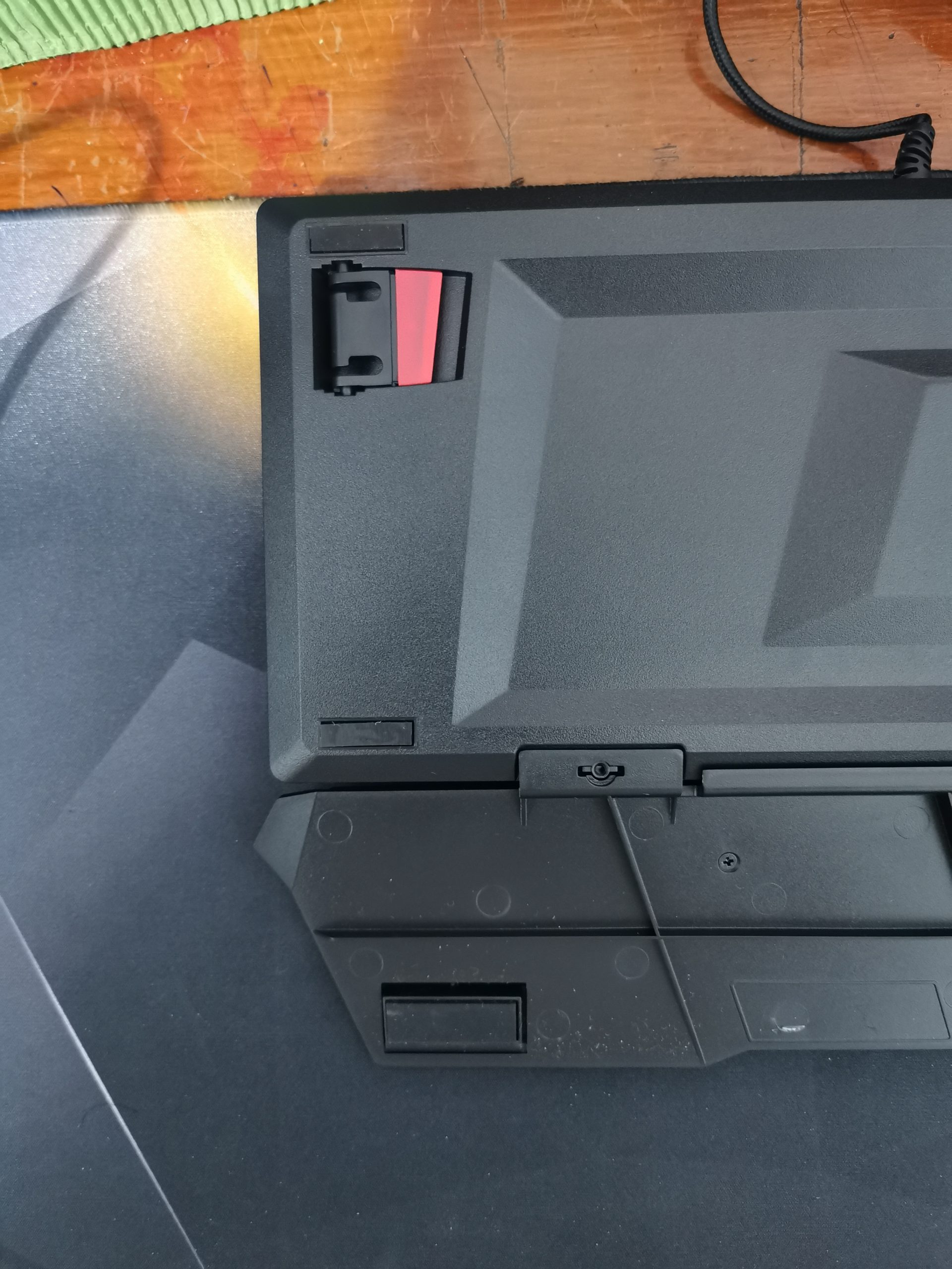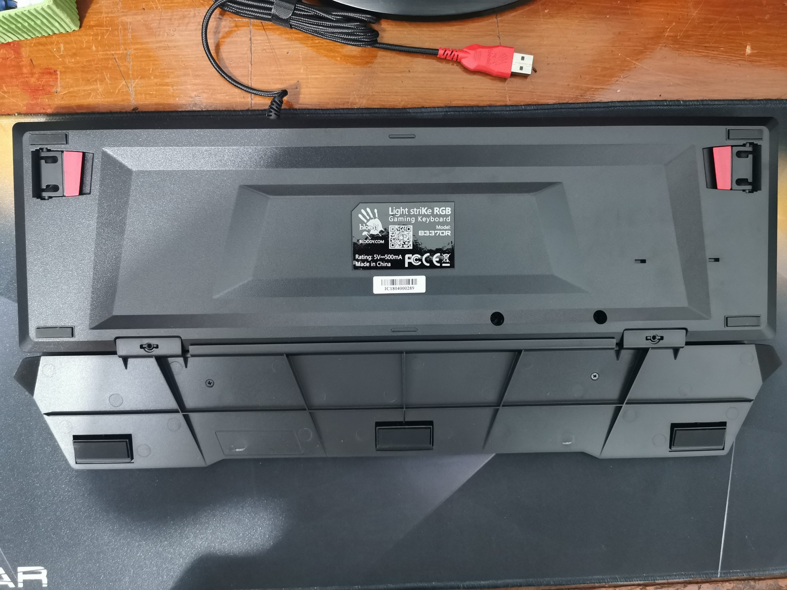 Terdapat kaki di bagian belakang keyboard yang bisa dibuka, kaki itu disarungi karet, cukup aneh karena biasanya karet hanya ditempelkan tetapi mungkin agar karetnya tidak mudah terlepas. Terdapat tempat untuk menempelkan wrist pad dan dapat dikencangkan dengan baut kecil.
