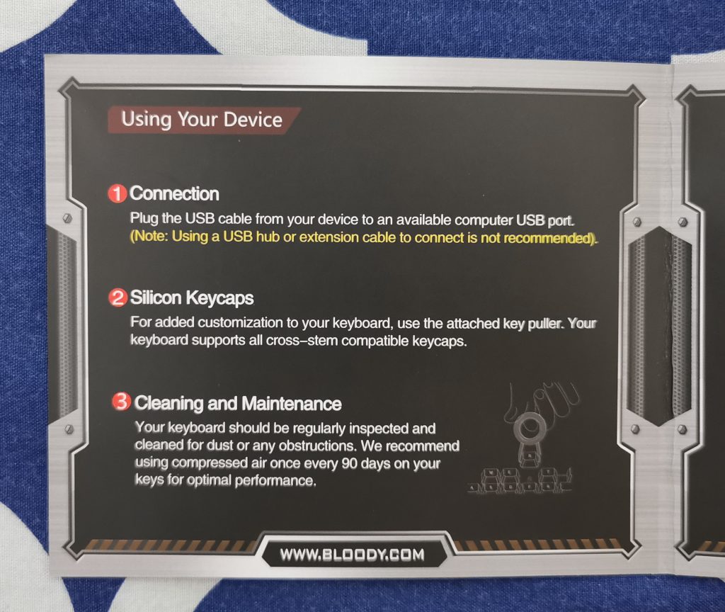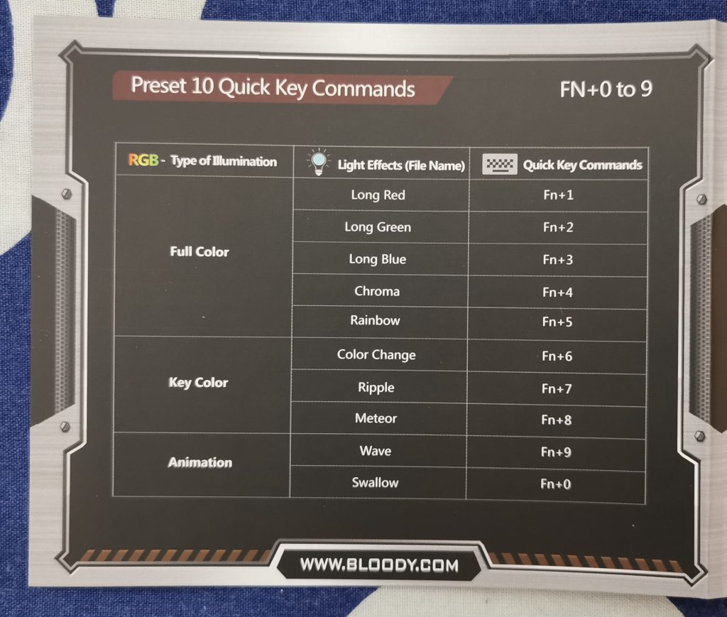 Buku panduan keyboard Bloody B3370R sederhana berisi informasi cara mengganti mode dan warna lampu keyboard.